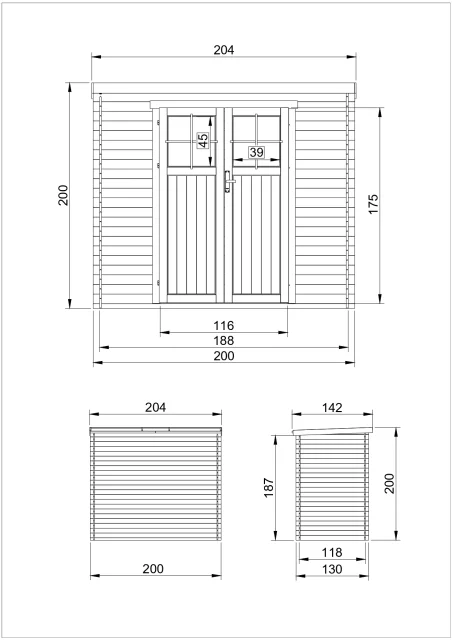 Lesena vrtna lopa - 204x142xH200 cm/2.22 m2 - Vrtna hiša Z vrati na zaklepanje, brez podov - TIMBELA M311F