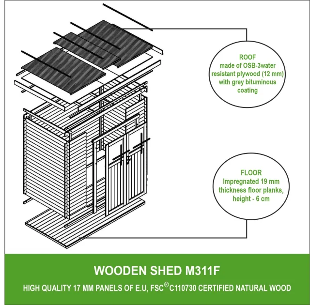 Lesena vrtna lopa - 204x142xH200 cm/2.22 m2 - Vrtna hiša z vrati na zaklepanje, s podi - TIMBELA M311F+M311G
