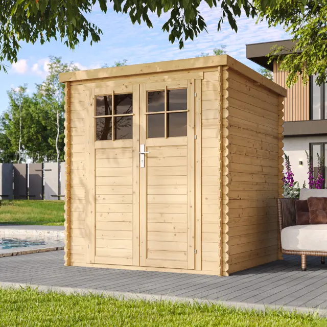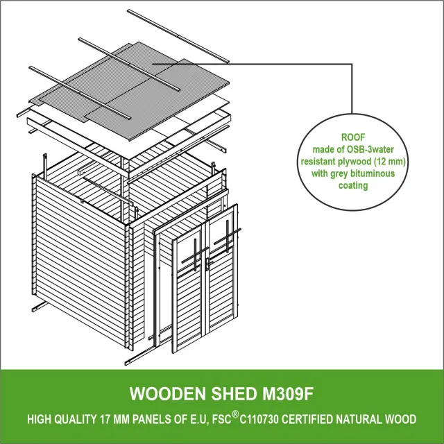Tehnične specifikacije neobdelane lesene lope M309F z visokokakovostnimi vrati na zaklepanje: