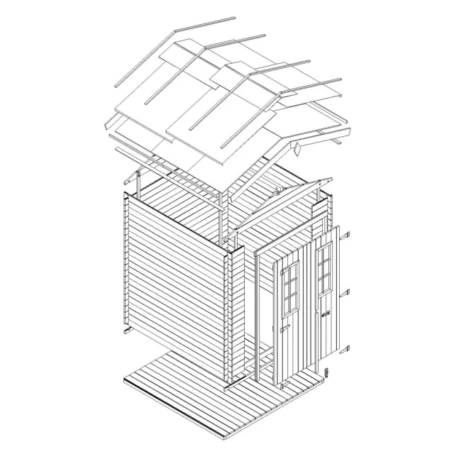 - Vsi leseni deli so dobavljeni neobdelani. Med montažo je treba les premazati s sredstvom za zaščito lesa, da preprečimo gnitje. Zunanjost mora biti takoj po namestitvi prebarvana s pigmentiranim lakom za zaščito lesa z odprtimi porami.