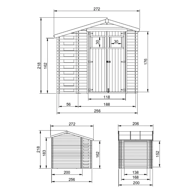 - Zunanje mere brez strehe: D256 x Š200 cm