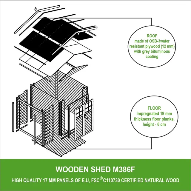 Tehnične lastnosti neobdelane lesene lope M386F+M386G s kakovostnimi vrati na zaklepanje in impregniranim podom: