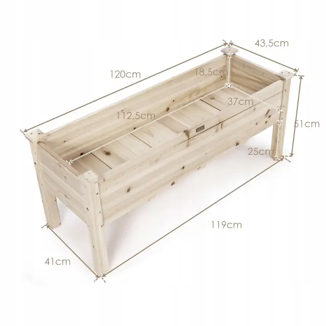 Primerna površina za sajenje: tlorisne mere so 120 x 43,5 x 51, notranje mere pa 112,5 x 37 x 18,5 cm. Naša dvignjena greda vam ponuja prostorno površino za gojenje rastlin na terasi, balkonu ali celo v zaprtih prostorih.