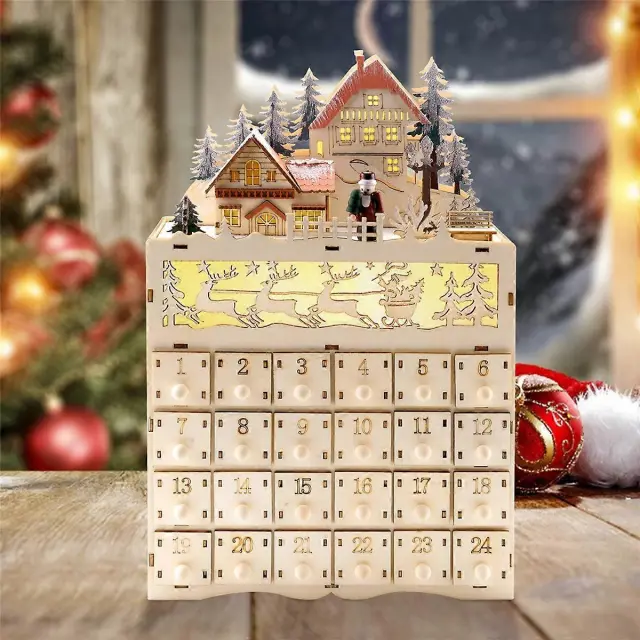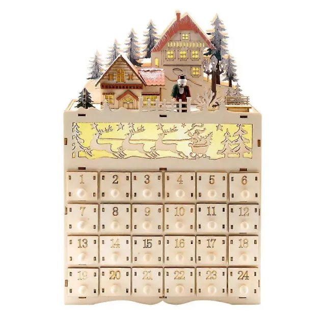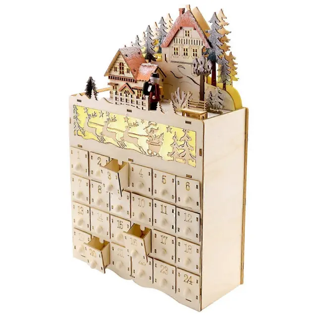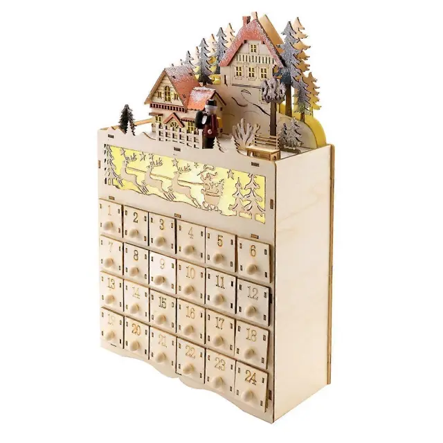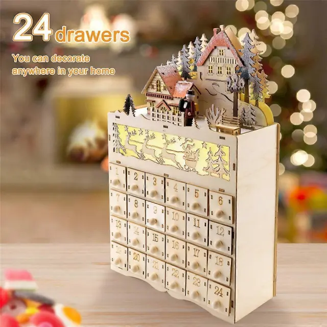 Leseni adventni koledar za božič, štetje nazaj za božično dekoracijo, 24 predalov z LED lučko