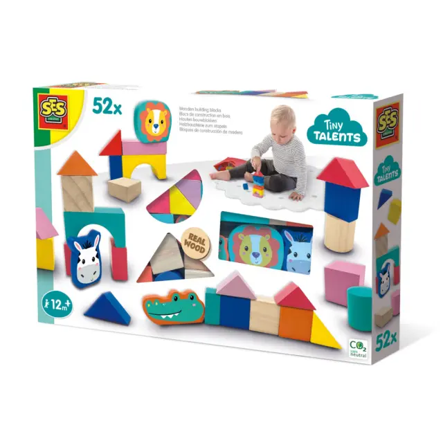 Ta komplet 52 gradbenih kock vsebuje lesene kocke in oblike v čudovitih, modernih barvah.