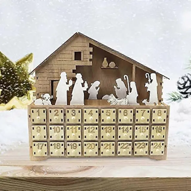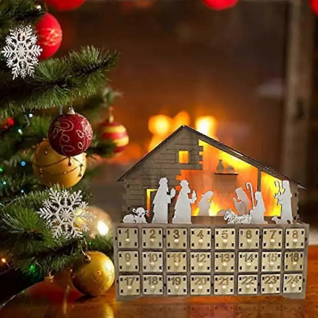 Leseni obrtni Jezusov adventni koledar z lučko, 24 oštevilčenimi predali, božična dekoracija za dom