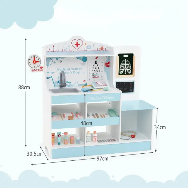 Optimalna organizacija: Ta imitacija bolnišnične ordinacije je opremljena z odprto polico, več razstavnimi policami in prostornim predalom za urejeno shranjevanje otroških medicinskih pripomočkov in opreme. To zagotavlja urejenost in dostopnost med igranjem vlog.