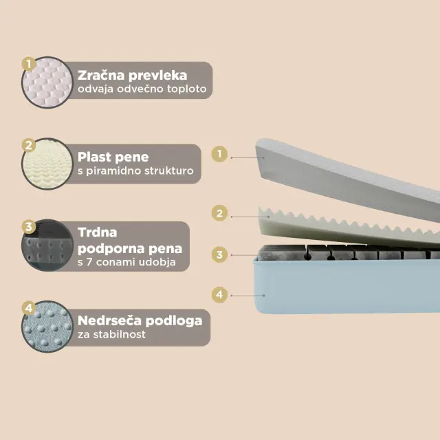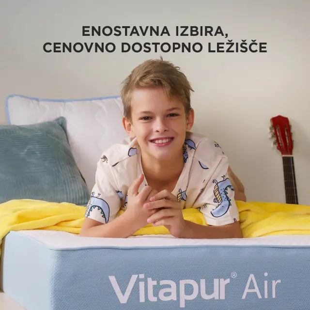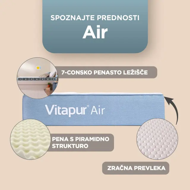 Naj gre za otroško sobo, študentski dom ali sobo za goste, Vitapur Air se zlahka prilagodi različnim potrebam. To ležišče, zasnovano za cenovno ozaveščene potrošnike, zagotavlja odlično udobje po ugodni ceni, pri tem pa ne sklepa kompromisov glede kakovosti. Ležišče Vitapur Air ima 7-consko podporno plast, ki vsakemu delu tvojega telesa zagotavlja ustrezno lego, ki jo potrebuje za resnično spokojen spanec. Plast pene z edinstveno piramidno strukturo ublaži točke pritiska in razbremeni telo. Poleg tega zračna prevleka poskrbi za svežino vso noč, tako da je vsak spanec tako udoben, kot mora biti. Vitapur Air – cenovno dostopno udobje, premišljeno izdelano za vsakogar.