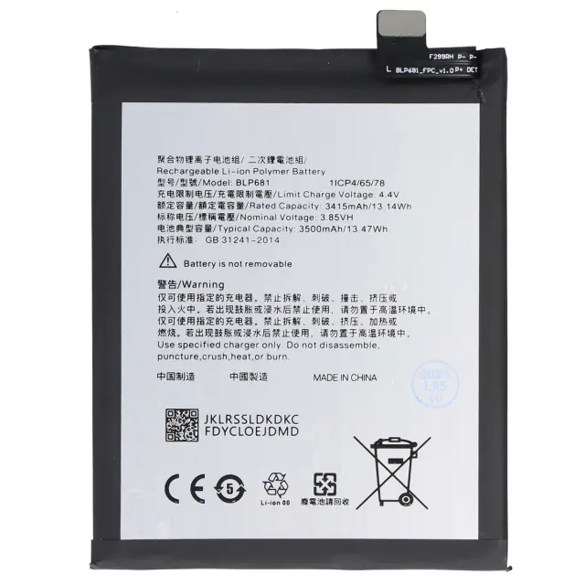 Ta baterija ima zmogljivost 3500 mAh, kar zagotavlja dobro avtonomijo.. 3,85 V napetost za stabilno delovanje. Nadomestna baterija model OPPO BLP681. Zasnovan za modela OPPO F9 in R17.