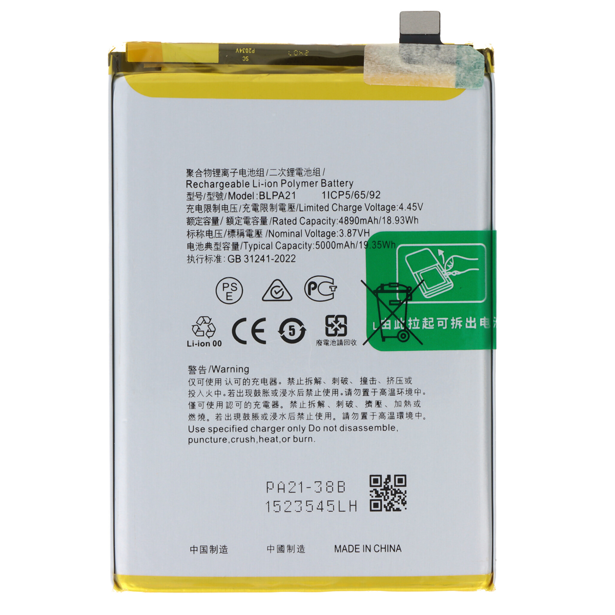 Tipična zmogljivost te baterije je 4890 mAh ali 18,9Wh. Nadomestna notranja baterija za OPPO A18 in A18 4G. Nazivna zmogljivost 4790mAh ali 18,5Wh. Nazivna napetost 3,87 V z mejno napetostjo 4,45 V.