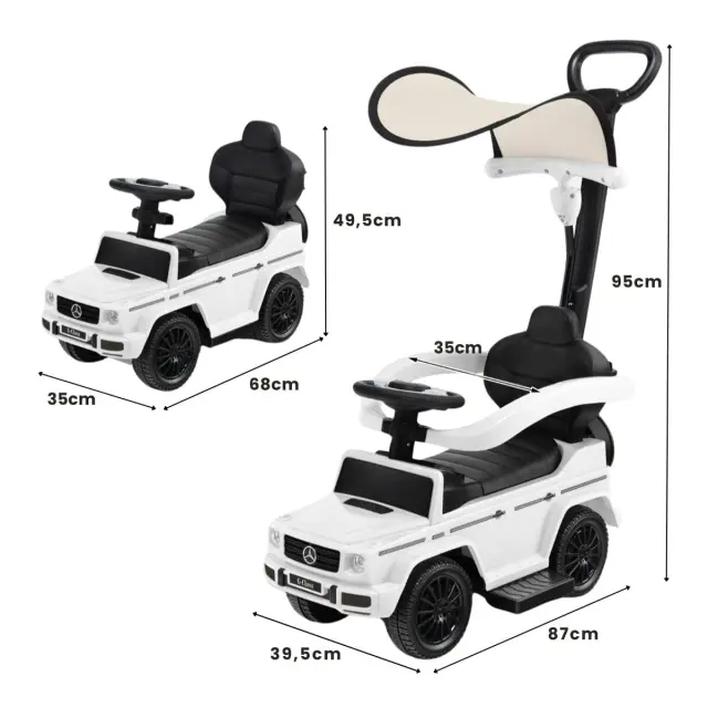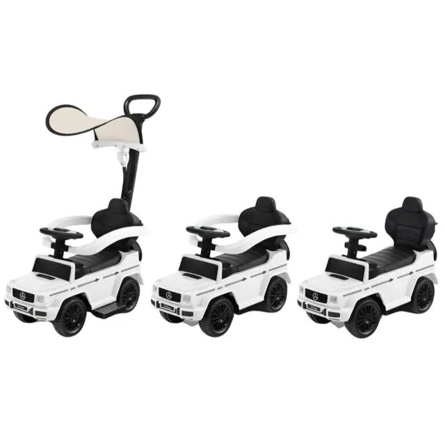 Licencirano otroško vozilo Mercedes Benz z nastavljivo streho proti soncu in otroškim vozičkom z ročajem za starše Bela