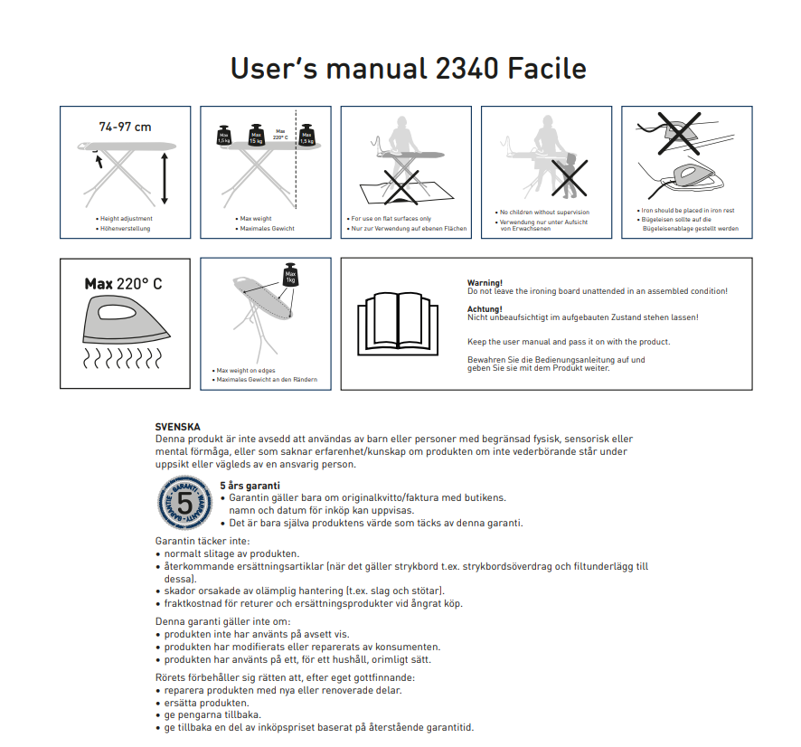 Konstrukcija ponuja štiri nastavljive višine, ki jih je mogoče enostavno prilagoditi z ročico pod desko, z največjo višino 90 cm za ergonomsko uporabo. Likalna površina 33×103 cm zagotavlja učinkovito območje, dobro prilagojeno vsakodnevnemu likanju.