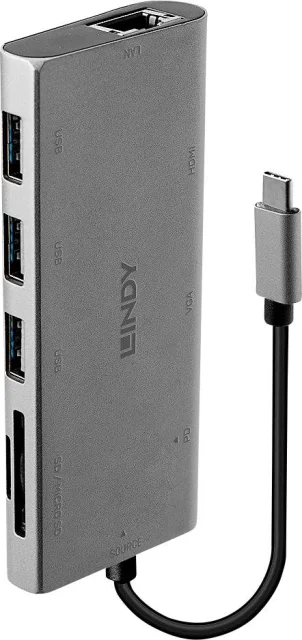 LINDY 43278 USB-C pretvornik [1x moški konektor USB-C - 3x USB 3.2 gen. 1 vtičnica A (USB 3.0), ženski konektor VGA, ženski konektor HDMI, RJ45 vtični