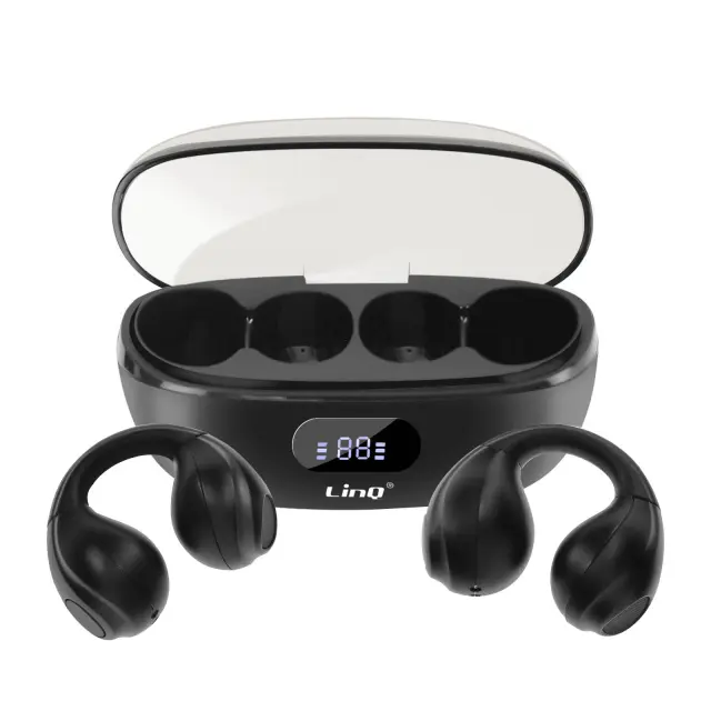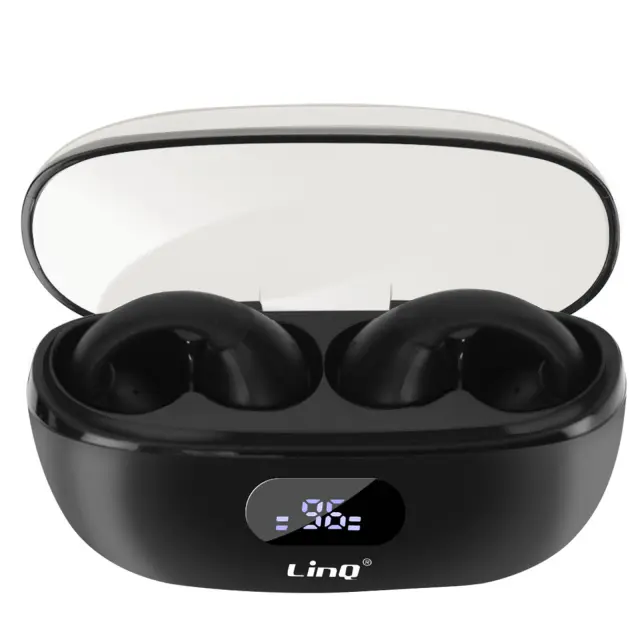 Črne slušalke Bluetooth LinQ s tehnologijo zračnega prevajanja, s katero lahko uživate v skladbah in ste hkrati pozorni.. Brez kabla in s sponko za varno držanje med dejavnostmi in vadbo. Ergonomsko oblikovan, da se udobno prilega ušesom. Vsestranska uporaba z vgrajenim mikrofonom za enostavne klice.