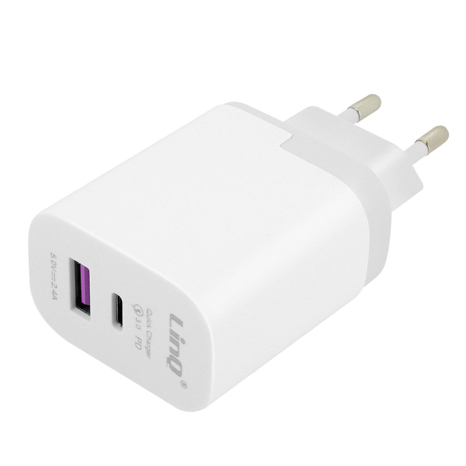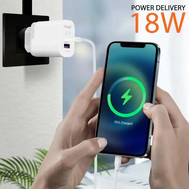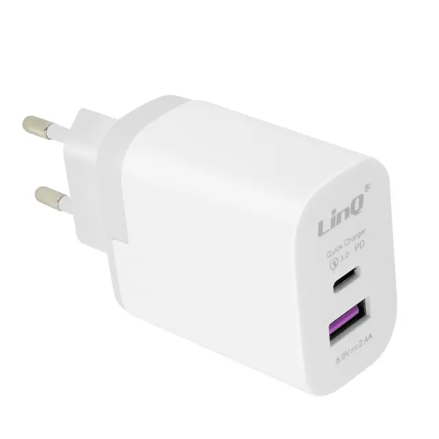 Zanesljiv in učinkovit omrežni polnilnik LinQ z dvema izhodoma. 2x USB + USB Type C izhodna vrata, zato lahko hkrati polnite 2 napravi.... USB-C Power Delivery 18 W: združljiv s hitrim polnjenjem za iPhone (0-50 % v 30 min). Izhod USB 2,4 A s hitrim polnjenjem Quick Charge 3.0 (0-70 % v 30 min za telefone Android)..