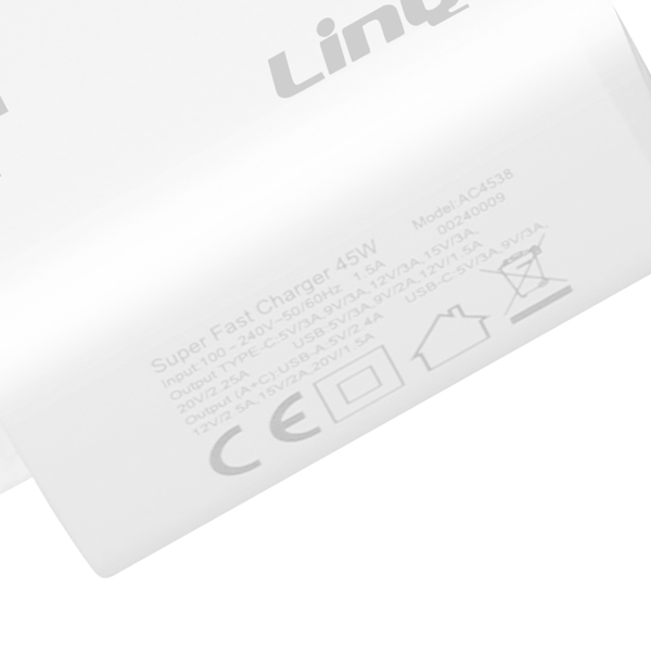 LinQ, Omrežni polnilnik USB C Power Delivery 45 W in USB Quick Charge 3.0 18 W, Bela