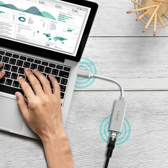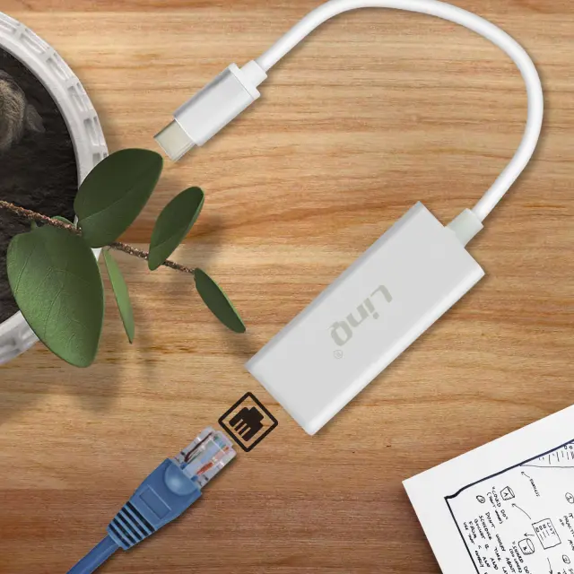 Ethernet adapter, namenjen vsem napravam z vhodom USB-C, model LAN-TPC20. pametni telefon, tablični računalnik ali računalnik povežite z lokalno ethernetno vtičnico. Za delovanje je potreben poseben ethernetni kabel (ni vključen). Vključi in uporabljaj, ni potrebna posebna konfiguracija.