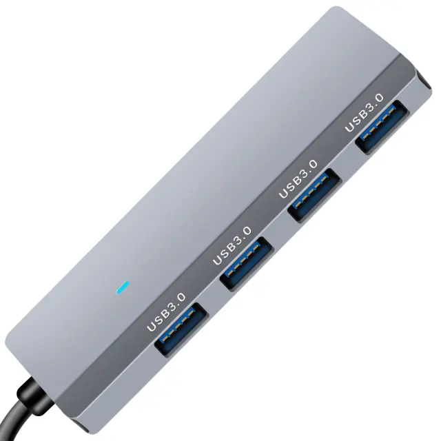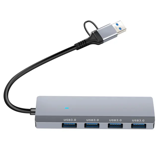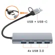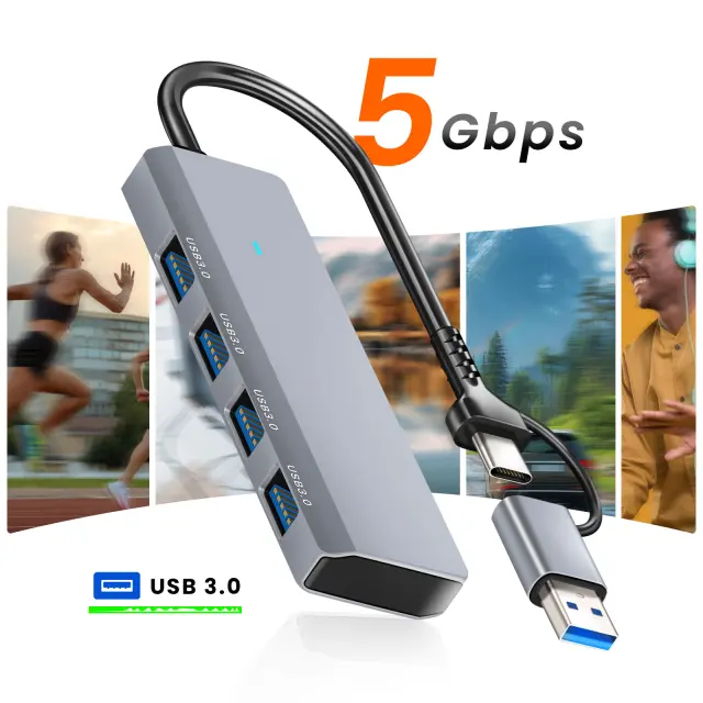 Razdelilnik USB-C 4-v-1 s 4 priključki USB 3.0 za takojšnjo razširitev povezljivosti. Hitrost prenosa do 5 Gb/s je idealna za velike datoteke in varnostne kopije. Združljiv s pametnimi telefoni, tabličnimi računalniki, osebnimi računalniki in računalniki MacBook s funkcijo OTG. Zagotavlja adapter USB-C z USB-A za vsestransko povezavo.