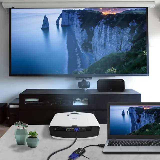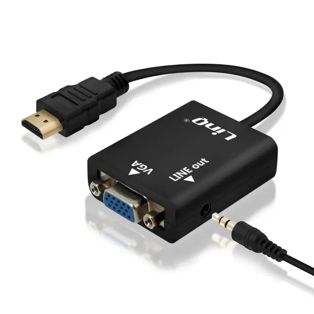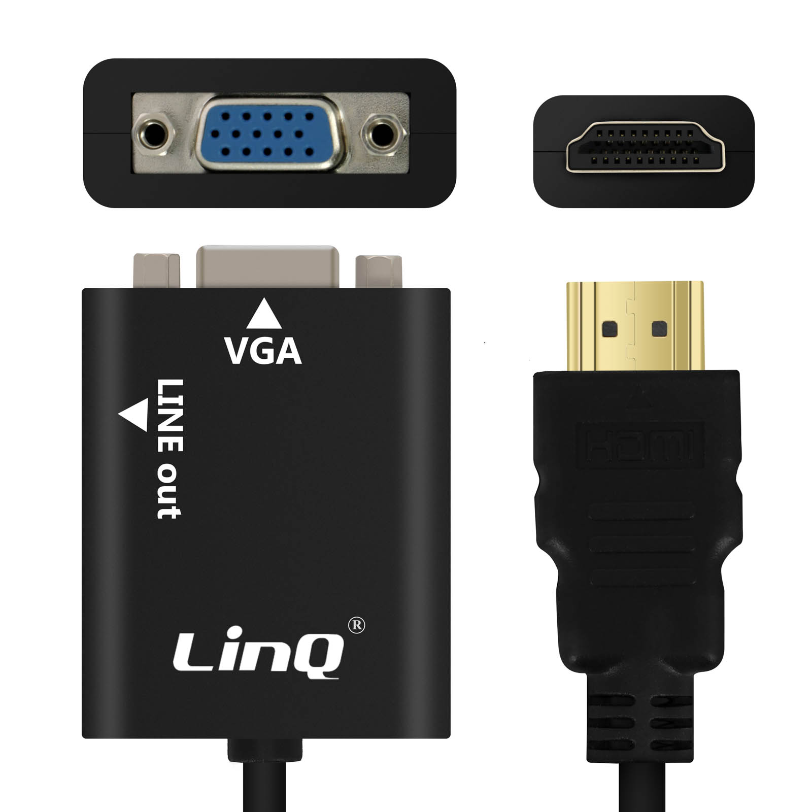 Video in avdio kabel/priključek HDMI moški na VGA ženski, ki ga je zasnoval LinQ. Povežite prenosni računalnik ali televizijski sprejemnik s projektorjem, monitorjem itd.. digitalni signal pretvori v analogni video signal (ločljivost: 1920x1080 v formatu 16/9). Podpira tudi prenos zvoka s priloženim 3,5-milimetrskim kablom.