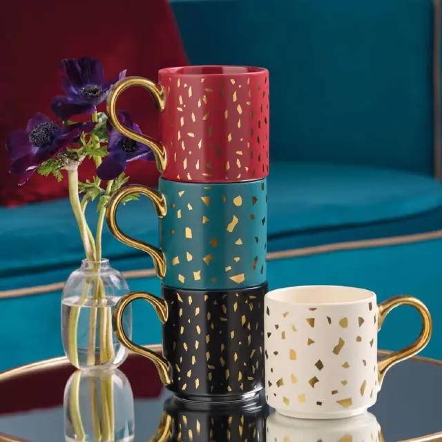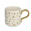 Lonček Friz s prostornino 350 ml je izdelan iz kakovostnega porcelana New Bone China. Svojo edinstvenost izžareva v krem barvi, ki jo elegantno dopolnjujeta pozlačen ročaj in subtilni zlati terrazzo detajli. Zaradi občutljivih pozlačenih elementov lonček ni primeren za uporabo v mikrovalovni pečici in pomivanje v pomivalnem stroju. Pakiran je v lični darilni embalaži, zato je odlična izbira kot prefinjeno darilo za vse ljubitelje toplih napitkov.