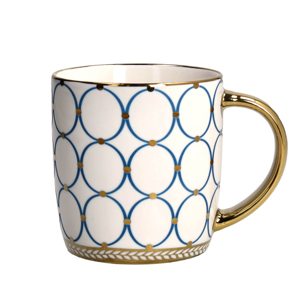 Eleganten lonček Graffiti s prostornino 360 ml je izdelan iz kakovostnega porcelana New Bone China. Odlikujejo ga sodobne geometrijske oblike, ki jih dopolnjuje pozlačen ročaj in skrbno dodani pozlačeni detajli, kar mu daje prestižen in unikaten videz. Lonček je pakiran v lični darilni embalaži, zato je popolno darilo za posebne priložnosti. Zaradi dekorativnih zlatih zaključkov ni primeren za uporabo v mikrovalovni pečici in pomivanje v pomivalnem stroju.