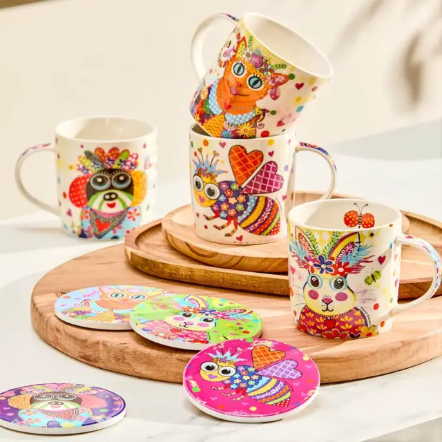Lonček iz linije Kaleidoscope navdušuje z belo osnovo, poudarjeno z drznimi barvami in igrivim šarmom, ki popestrijo vsak trenutek ob najljubši pijači. Blagovna znamka Maxwell & Williams predstavlja edinstvene motive umetnice Donne Sharam iz Byron Baya v Avstraliji, ki prinašajo živahnost in pozitivno energijo v vaš dom. Lonček je izdelan iz kakovostnega, trpežnega porcelana ter primeren za uporabo v mikrovalovni pečici in pomivalnem stroju. Pakiran je v lični darilni embalaži v obliki hiške. Donna Sharam, bolj znana tudi kot »Kraljica barv«, je odraščala v avstralski divjini blizu Coonabarabrana, kjer je uživala v jahanju in plavanju v lokalnem potoku. Ko je dopolnila 18 let, se je iz podeželja preselila v Sydney, da bi študirala modno oblikovanje na Sydney College of the Arts, kar je spodbudilo njeno ustvarjalnost.