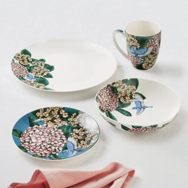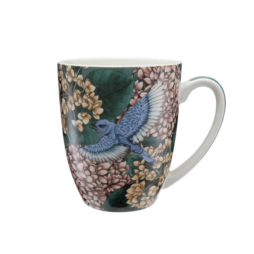 Lonček Reminisce Floral je bil zasnovana v sodelovanju z umetnico Nehe Gupte, znane kot Blck Pen iz Sydneyja. Izdelana je iz keramike v zelenem odtenku z veličastnim dizajnom bujnega cvetja hortenzij in listja v umetničinem značilnem slogu akvarela in črnila. S prostornino 420 ml je idealen za uživanje v izdatnem nalivu požirku vašega najljubšega čaja, kave ali kakava. Z dramatično temno paleto združuje svež, sodoben slog z romantiko klasičnega cvetja – čudovita ideja za darilo. NAMIG: Dopolnite ga še z ostalimi izdelki iz iste zbirke Reminisce, ki ponuja vrsto predmetov, vključno s krožniki in skledami, ki se ponašajo s kontrastnim učinkom, ustvarjenim s temeljno surovo keramiko Stoneware v kombinaciji z glazuro visokega sijaja.