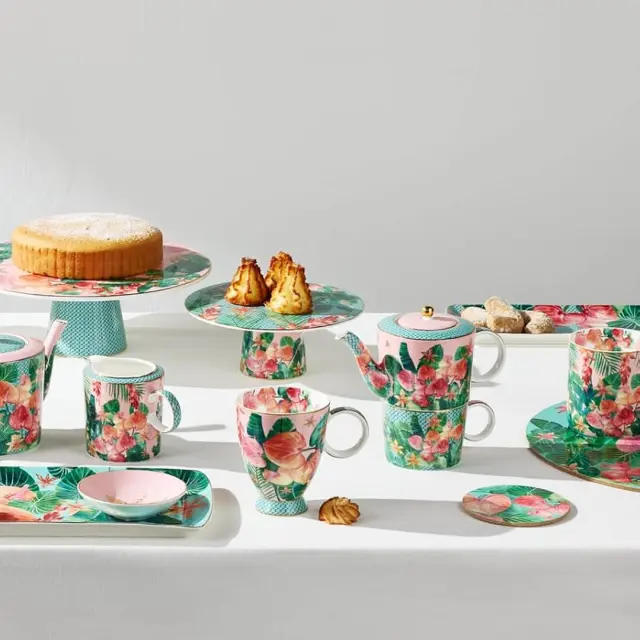 Odkrijte eksotično lepoto lončka iz linije Tropicana. Njegova posebnost je dovršena noga oz. podstavek, ki lončku daje prefinjen videz. Okrašen je z bogatim tropskim listjem in čudovitimi ingverjevimi lilijami v živahnih odtenkih roza, modre in zelene barve, ki vas bodo vsak dan popeljali v osrčje tropskega raja. Izdelan je iz kakovostnega porcelana s prostornino 300 ml, zato je popoln za vašo najljubšo kavo, čaj ali kakav. Primeren je za uporabo v mikrovalovni pečici in enostaven za čiščenje, saj ga lahko pomijete v pomivalnem stroju. Dodajte svoji jutranji rutini pridih tropske svežine. NAMIG: Lonček dopolnite z ostalimi izdelki iz iste linije Tropicana.