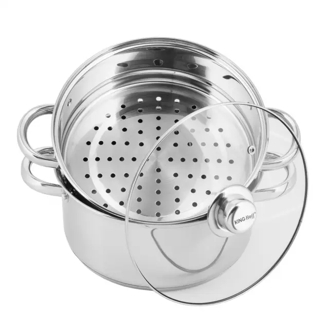 GARNITURA ZA KUHANJE NA PARI Z EVAPORJEM, sestavljena iz 3 ELEMENTOV, izdelana iz kvalitetnega visoko poliranega nerjavečega jekla 18/10 z dvojnim akutermalnim dnom. Uporabljen material ni samo najboljši možni, ampak tudi izgleda odlično in je izjemno enostaven za čiščenje. 1 x LONEC 5,0L / 24cm (visokokakovosten lonec za široko uporabo (24x11,5cm)) 1 x EVAPOR 3,5L / 24cm (deluje tudi s katerim koli drugim loncem 24cm (24x10cm)) 1 x stekleni POKROV 24cm (univerzalen) Srednja kapaciteta set priporočamo vsem, ki se želite zdravo prehranjevati. (mastna dieta), za tiste, ki imajo težave s prebavili (razjede, bolezni jeter in trebušne slinavke) in za vse, ki želijo opustiti. V primerjavi z drugimi načini kuhanja ta omogoča ohranjanje naravnega okusa hrane in skoraj vseh hranilnih snovi. Tako lahko kuhate meso, narezke, zelenjavo in ribe brez uporabe vode. Trojno akutermalno dno (patentirana sestava plasti posebne aluminijeve zlitine in visokokakovostnega nerjavečega jekla) odlično prevaja in akumulira toploto ter odlično ščiti kuhano hrano pred zažganjem in posodo pred obrabo. Dno lonca takoj absorbira najmanjšo količino energije, ki se enakomerno porazdeli po celotni površini dna lonca in tam shrani. Te lastnosti zagotavljajo optimalno prevajanje, porazdelitev in shranjevanje toplote. Lonce lahko uporabljate na vseh vrstah štedilnikov in čistite v pomivalnem stroju.