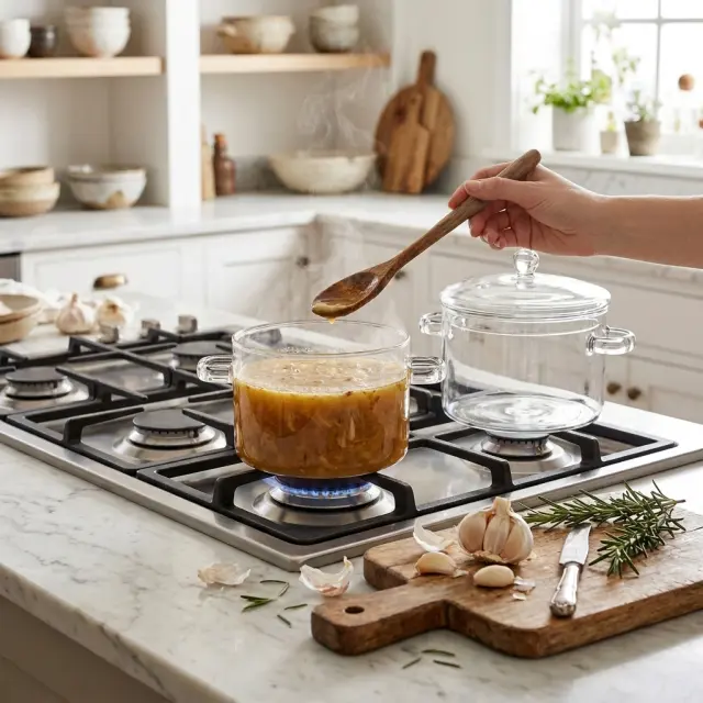Klasična oblika z dvema steklenima ročajema (“double ears”) zagotavlja stabilen oprijem in enostavno prenašanje, pokrov iz kaljenega stekla pa pomaga ohranjati toploto in aromo med kuhanjem. Lonec je primeren za uporabo na plinskem štedilniku ter na indukciji z ustreznim adapterjem. Uporabljate ga lahko tudi v mikrovalovni pečici. Pomivanje v pomivalnem stroju je možno, vendar je zaradi velikosti in varnejšega rokovanja priporočljivo ročno pomivanje.