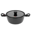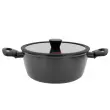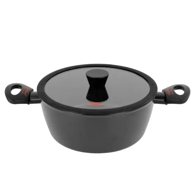 Lonec Chef Eco (24 cm) postavlja nove standarde vzdržljivosti in je prava izbira za tiste, ki cenijo trpežno in profesionalno posodo. Izdelan je iz kovanega jekla, žganega pri 820°C, ki je po celotnem robu zatesnjen s črnim emajlom. Lonec se hitro segreje, zato prihrani več kot 40% energije. Notranjost ima troslojni nelepljivi premaz QuanTanium, ojačan s titanovimi delci, dvojni ergonomski toplotnoizolacijski ročaj iz mehke plastike (Soft-Touch), pa poskrbi za udoben in varen oprijem brez drsenja. Lonec je primeren za uporabo na vseh kuhalnih površinah, tudi na indukciji. Kontaktna površina oz. podnožje lonca meri približno 19 cm. Ploski steklen pokrov s silikonskim robom in odprtino za paro omogoča stalen vpogled v vsebino posode. Lonec pomijte ročno. Višina lonca brez pokrova meri 10,4 cm.