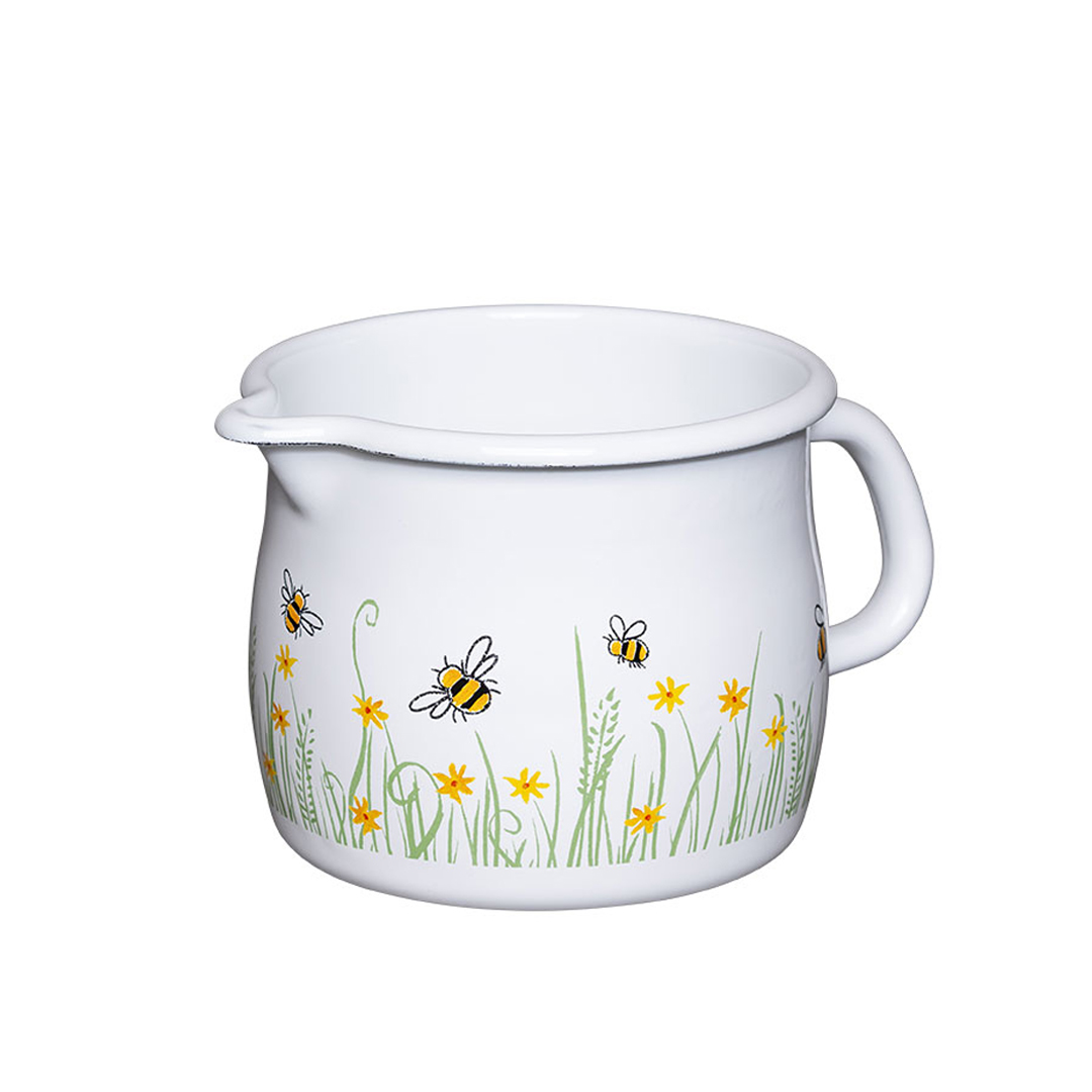 Riess lonec Bee (12 cm) s trebušasto obliko zaradi praktičnega izliva imenujemo tudi »lonec s kljunom«. V njem lahko enostavno segrejete mleko, omako, pa tudi druge tekočine kot so na primer juhe, iz lonca pa lahko tekočine enostavno nalivate brez uporabe zajemalke. Spenjeno mleko za jutranjo kavo ali juho v krožnik se iz lonca s kljunom nalije brez najmanjših težav. S svojim okroglim ročajem, zaobljenim robom in simpatičnim dizajnom čebelic, je primeren tudi za postrežbo neposredno na mizo. Izdelan je iz emajla. To je železo, ki je pri visokih temperaturah stopljeno s steklom. Emajlirana posoda je priporočljiva tudi za ljudi z alergijami na nikelj. Lonec lahko uporabite na vseh vrstah štedilnikov (plinskih, električnih, steklokeramičnih, indukcijskih in tudi na odprtem ognju). Zaradi železnega jedra emajl hitro prevaja toploto in jo trajnostno shrani za energetsko varčno kuhanje. Popolno higieno zagotavlja gladka steklena površina brez por. Le-ta ne vpliva na okus, zavira razmnoževanje mikroorganizmov in je poleg tega enostavna za čiščenje. Ob pravilni uporabi in ustrezni negi bo posoda iz emajla zdržala dolgo časa in ohranila svoj tipičen sijaj. Primerna je za pomivanje v pomivalnem stroju. NAMIG: Preverite še ostalo ponudbo posode iz linije Biene. NASVET: Pred segrevanjem mleka nalijte v lonec s kljunom nekaj kapljic vode in segrevajte samo na srednje močni vročini, da se mleko ne bo prismodilo.