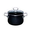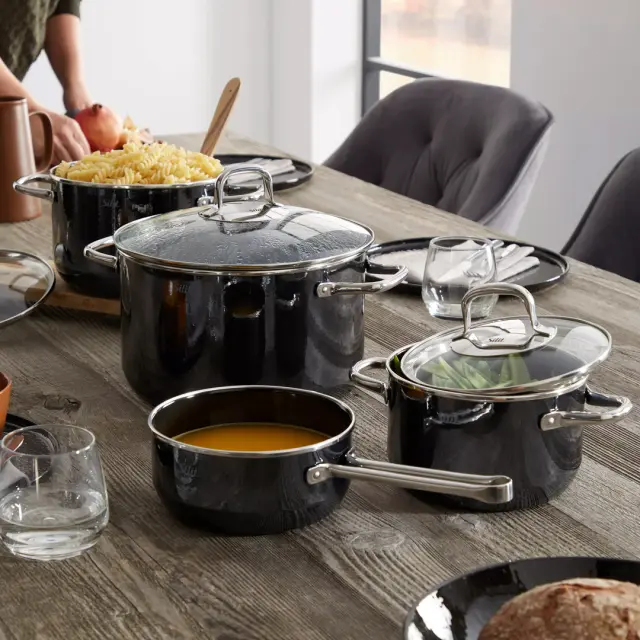 Lonec premera 16 cm, je del linije Nouvelle Black Magic, ki navdušuje s svojim modernim dizajnom in vznemirljivo mešanico materialov. Posoda s steklenim pokrovom ima priročno oblikovan ročaj iz nerjavečega jekla v modernem dizajnu in omogoča stalen vpogled v vsebino. Izdelana je iz emajla - materiala iz železa, ki je bil pri visokih temperaturah spojen s steklom. Emajliran lonec lahko uporabljate na vseh vrstah štedilnikov (plinskih, električnih, steklokeramičnih, indukcijskih in tudi na odprtem ognju). Zahvaljujoč dobri toplotni prevodnosti emajla so tudi stene posode vsepovsod tople, kar prihrani energijo. Robusten kromiran rob preprečuje krušenje. Neporozna, gladka steklena površina zagotavlja popolno higieno, je nevtralna glede arome in zavira razvoj bakterije ter je enostavna za čiščenje, saj jo lahko pomijete v pomivalnem stroju. Ob pravilni uporabi in negi bo emajlirana posoda dolgo zdržala in ohranila tipičen sijaj. Priporoča se tudi ljudem z alergijami na nikelj. NAMIG: Preverite še ostalo ponudbo posode iz linije Black Magic.
