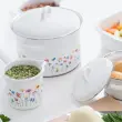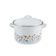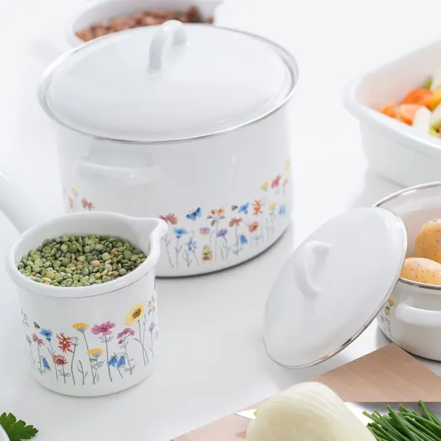 Klasična oblika emajliranega lonca s pokrovom Flora (14 cm) navdušuje z enostavno obliko ter izjemnim cvetličnim dekorjem. Visok lonec je kot tak idealen za kuhanje velikih količin z veliko tekočine, od juh, kuhane govedine, enolončnic, raguja, testenin, zelenjave, krompirja in še veliko več. Vrh lonca zaključuje robusten kromiran rob. Priložen pokrov deluje kot kontrolor energije: takoj ko začne ropotati, je čas, da zmanjšate toploto in s tem prihranite energijo. Glede na vrsto štedilnika se lahko približno 5 minut pred koncem kuhanja štedilnik popolnoma izklopi, saj emajl dolgo časa ohranja toploto. Posodo lahko uporabite na vseh štedilnikih (plinski, električni, steklokeramični, indukcijski in celo na odprtem ognju). Zahvaljujoč jedru iz železa se toplota hitro prevaja in nato shrani: za trajnostno, energijsko varčno kuhanje. Prednost emajliranih ročajev je v tem, da za ohranjanje toplote lonec mirno lahko postavite tudi v pečico. Priporočamo, da pri dviganju loncev in pokrovov uporabljate debele prijemalke za lonce, saj se emajlirani ročaji med kuhanjem segrejejo in ravno tako ohranjajo temperaturo. Popolno higieno zagotavlja gladka steklena površina brez por. Le-ta ne vpliva na okus, zavira razmnoževanje mikroorganizmov in je poleg tega enostavna za čiščenje. Ob pravilni uporabi in ustrezni negi bo posoda iz emajla zdržala dolgo časa in ohranila svoj tipičen sijaj. Primerna je za pomivanje v pomivalnem stroju. Emajl kot material je sestavljen iz železa, ki se pri visoki temperaturi spoji s steklom, torej je iz naravnih surovin. Preverite še ostalo ponudbo posode iz linije Flora.