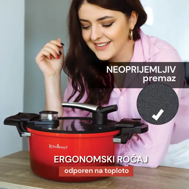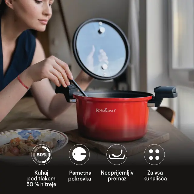 Spoznaj novi lonec za kuhanje pod tlakom Rosmarino Fresh Cooker, ki tvoje jedi še hitreje pripelje do slastnega cilja. V primerjavi s tradicionalnim kuhanjem prepolovi čas priprave, hkrati pa prihrani do 70 % več energije kot kuhanje v ekonom loncu. Obenem je kuhanje pod nižjim tlakom popolno za začetnike, saj je zaradi počasnejšega sproščanja pare varnejše kot uporaba ekonom lonca. Takšen način kuhanja ohranja naravne okuse in teksture živil ter poskrbi, da se živila ne razkuhajo. Ker pomaga zadržati več vitaminov, mineralov in drugih hranilnih snovi v hrani, bodo tvoji obroki bolj zdravi. Zaradi posebnega premaza proti prijemanju se živila ne oprijemajo posode, kar olajša tudi čiščenje. Z našo novo posodo za kuhanje pod tlakom Fresh Cooker bodo tvoji obroki bolj zdravi in hitreje pripravljeni ter bodo navdušili s slastnim okusom in popolno teksturo!