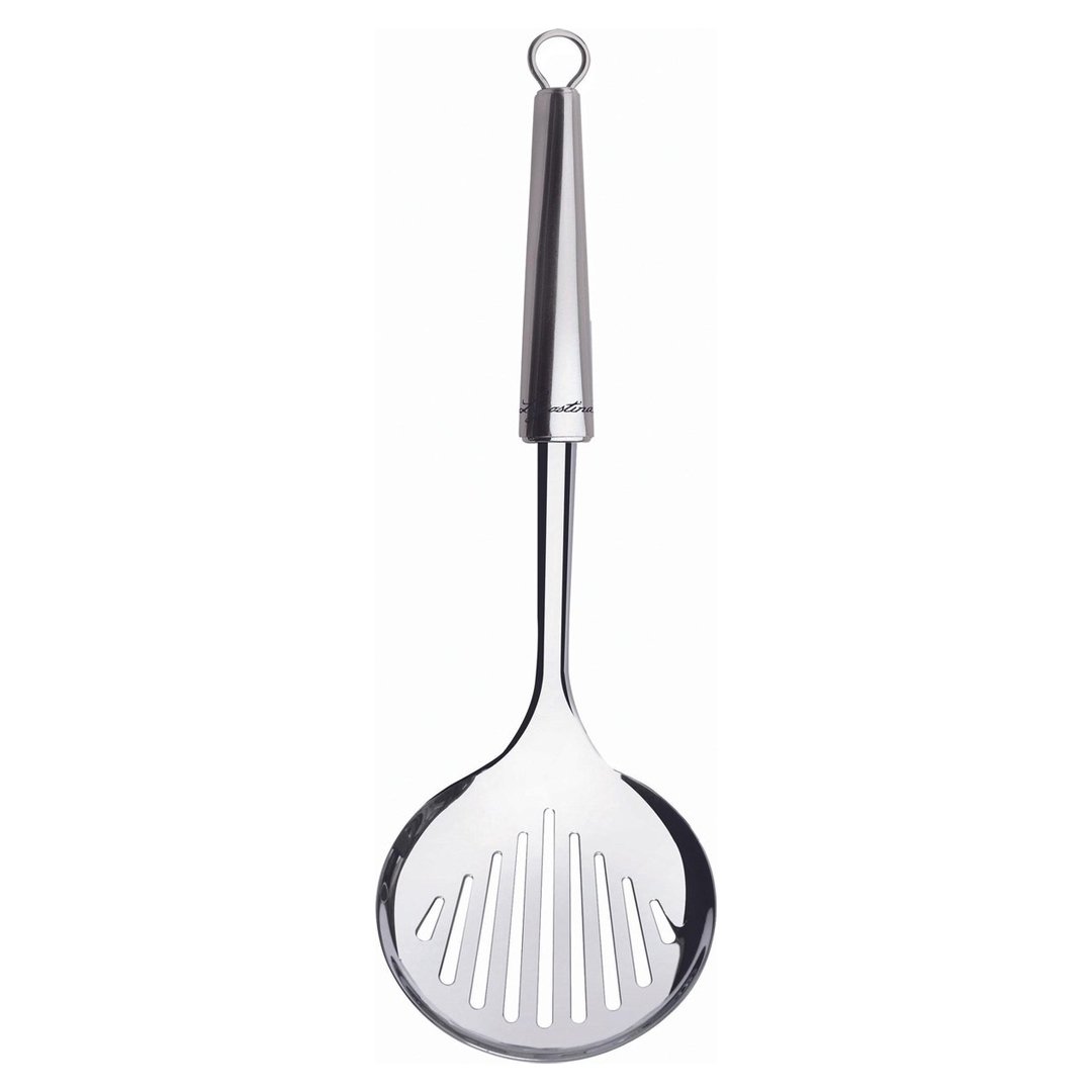 LAGOSTINA OKROGLA LOPATKA ZA OBRAČANJE CUCINIERI z dolžino 33 cm je nepogrešljiv pripomoček v vsaki kuhinji. Reže na lopatici omogočajo, da odvečna maščoba odteče skoznje. Izdelana je iz visokokakovostnega nerjavečega jekla 18/10, za katerega je značilna visoka obstojnost, odpornost proti koroziji in živilskim kislinam. Ergonomsko oblikovan ročaj, zagotavlja udobje med njeno uporabo, držalo na koncu pa omogoča obešanje. Primerna je za pomivanje v pomivalnem stroju.
