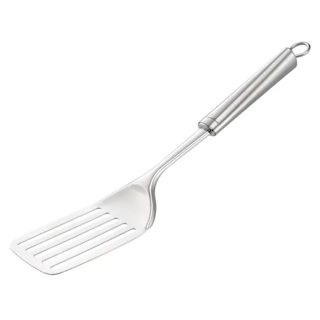LAGOSTINA LOPATKA ZA OBRAČANJE iz linije Cucinieri je nepogrešljiv pripomoček v vsaki kuhinji. Reže na lopatici omogočajo, da odvečna maščoba odteče skoznje. Izdelana je iz visokokakovostnega nerjavečega jekla 18/10, za katerega je značilna visoka obstojnost, odpornost proti koroziji in živilskim kislinam. Ergonomsko oblikovan ročaj, zagotavlja udobje med njeno uporabo, držalo na koncu pa omogoča obešanje. Primerna je za pomivanje v pomivalnem stroju.