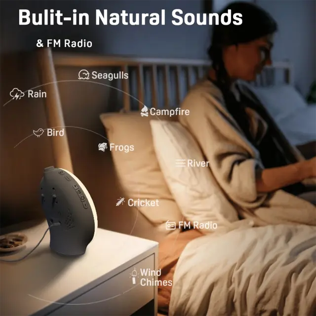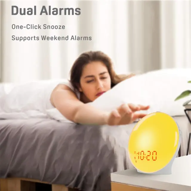 Naravno prebujanje s svetlobo – Intenzivnost svetlobe se postopoma povečuje v 10 do 60 minutah in doseže svetlo, toplo belo svetlobo za nežno prebujanje. 7-barvna nočna svetilka – Izberite med 7 barvami (rdeča, toplo bela, zelena, modra, roza) in 20 stopnjami svetlosti, idealno za zaspanje in sprostitev. Dvojni časi prebujanja s funkcijo dremeža – Nastavite dva časa prebujanja in uporabite funkcijo dremeža za dodaten spanec. Več zvokov prebujanja in FM radio – Izberite med 7 naravnimi zvoki prebujanja ali uporabite vgrajen FM radio (78,0–108 MHz). Vsestranske funkcije – S svetovnim časom, nočno lučko, alarmom, osvetlitvijo in dekorativnimi elementi za funkcionalno in elegantno obliko.