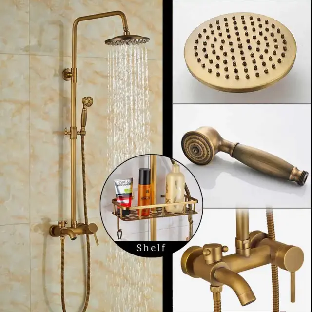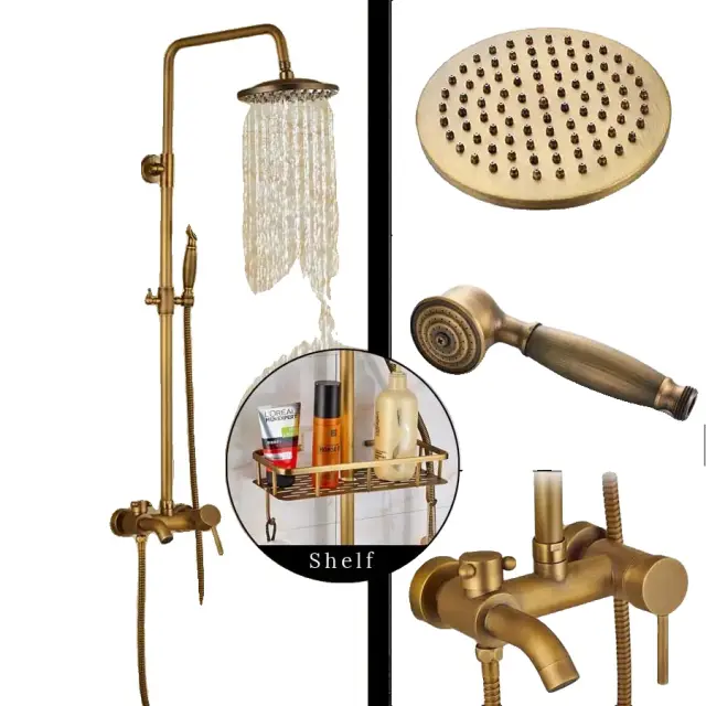 Luksuzni mešalni pipa za tuš, 200mm mesingasta tuš glava, nastavljiva višina 700mm-1200mm, antikna s policem
