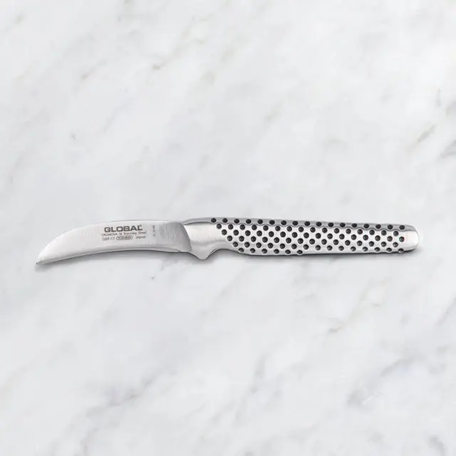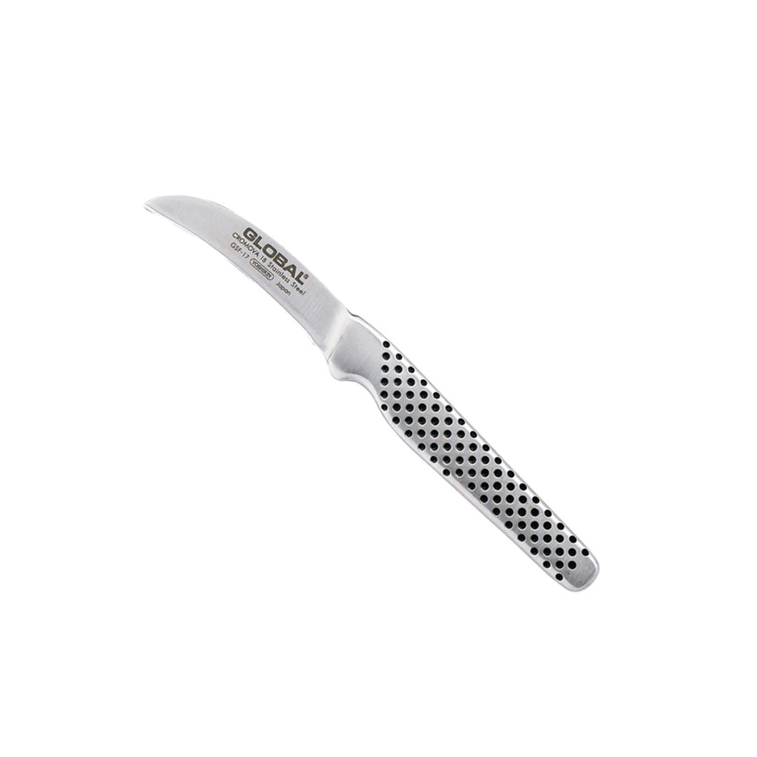 Nož Global serije GSF-17 z ukrivljenim 6 cm rezilom in 15-stopinjskim rezalnim robom za rezanje, lupljenje ali strganje sadja in zelenjave, je izdelan iz kakovostnega nerjavečega jekla Cromova 18. Posebna oblika ročaja s pikami zagotavlja enostaven in varen oprijem, ukrivljeno rezilo pa omogoča enostavno lupljenje okroglega sadja ali zelenjave, kot so jabolka ali krompir. Nož je oblikoval japonski umetnik Komin Yamada kot spev veliki tradiciji japonskih samurajev in so ena od prvih izbir v svetu gastronomije. Vzdrževanje: operite ga v vroči vodi in dobro obrišite s suho krpo.