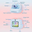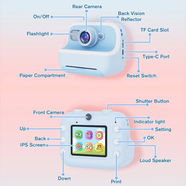 1. Material: ABS + silikon 2. Zaslon: 2,4-palčni IPS zaslon 3. Ločljivost: 240 x 320 4. Fotografiranje brez kartice: podprto, lahko posname približno 24 fotografij 5. Pomnilniška kartica: ni vključena, največja podpora 32G 6. Število kamer: dvojne kamere 7. Slikovne pike objektiva: 100 W za sprednjo in zadnjo kamero 8. Foto slikovne pike: do 4800 W 9. Video slikovne pike: 1080P 10. Način polnjenja: Type-C/USB-C 11. Kapaciteta baterije: 1500 mAh polimerna litijeva baterija 12. Čas uporabe: 4-5 ur (brez tiskanja) 13. Čas polnjenja: 2-3 ure 14. Funkcije izdelka: snemanje videa, fotografiranje, predvajanje videa, igre, foto kabina, mp3 15. Podprti jeziki: poenostavljena kitajščina, tradicionalna kitajščina, angleščina, japonščina, korejščina, francoščina, nemščina, italijanščina, portugalščina, španščina, arabščina 16. Puzzle igre: Snake, Push Box, Tetris 17. Velikost izdelka: 100 x 85 x 57 mm 18. Teža izdelka: približno 201 gram Seznam pakiranja: -Kamera x 1 -Papir za tiskanje x 3 -Kabel USB x 1 -Navodila za uporabo x 1 -Vrv x 1 Teža enega paketa: 0,43 kg / 0,95 lb Velikost enega paketa: 16 cm * 6 cm * 12 cm / 6,3 palca * 2,36 palca * 4,72 palca