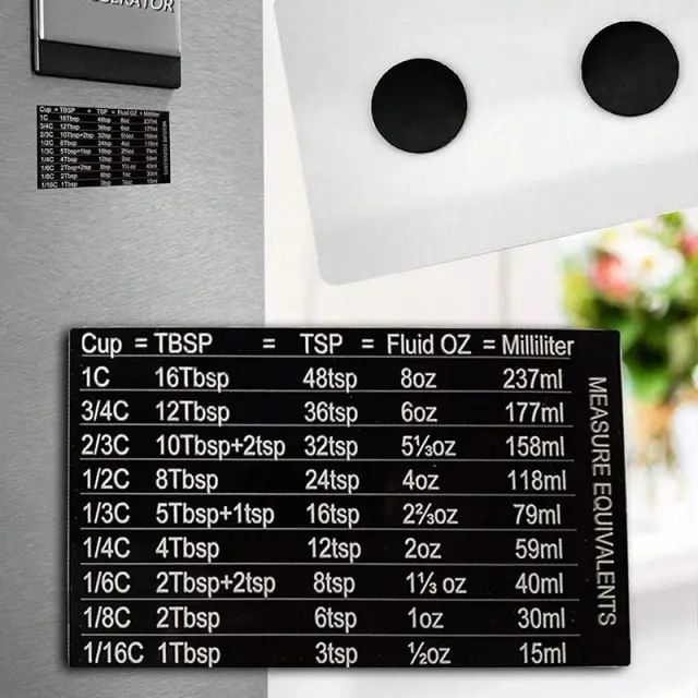 Močan magnetni hrbet: Ta magnetna tabela pretvorbe se varno pritrdi na katero koli magnetno površino, kot so hladilnik, pečica ali žar. Ne bo zdrsnila ali padla, tudi če se vam mudi.