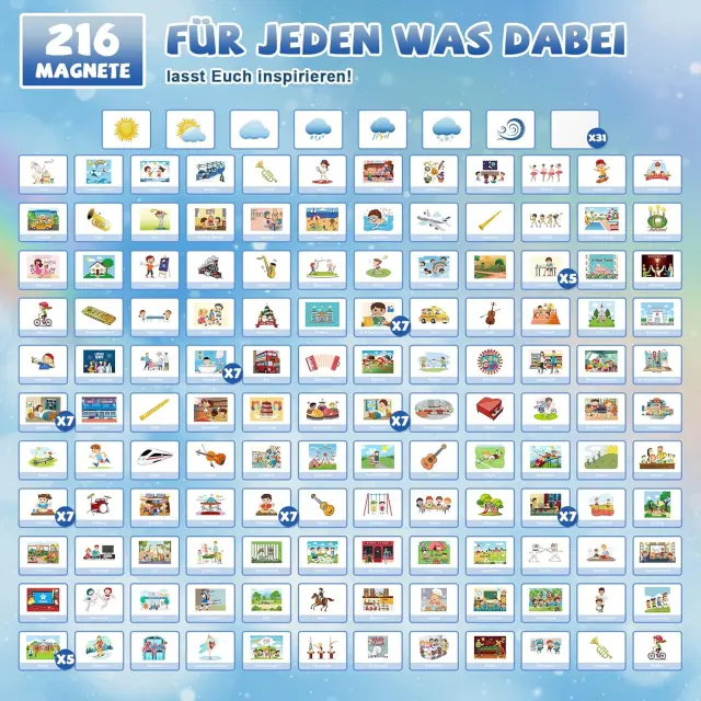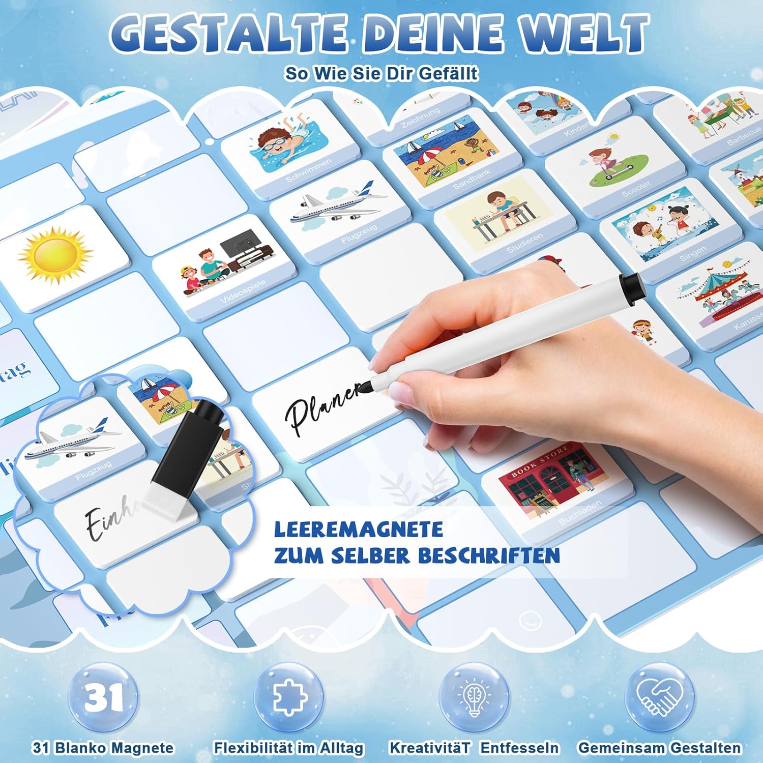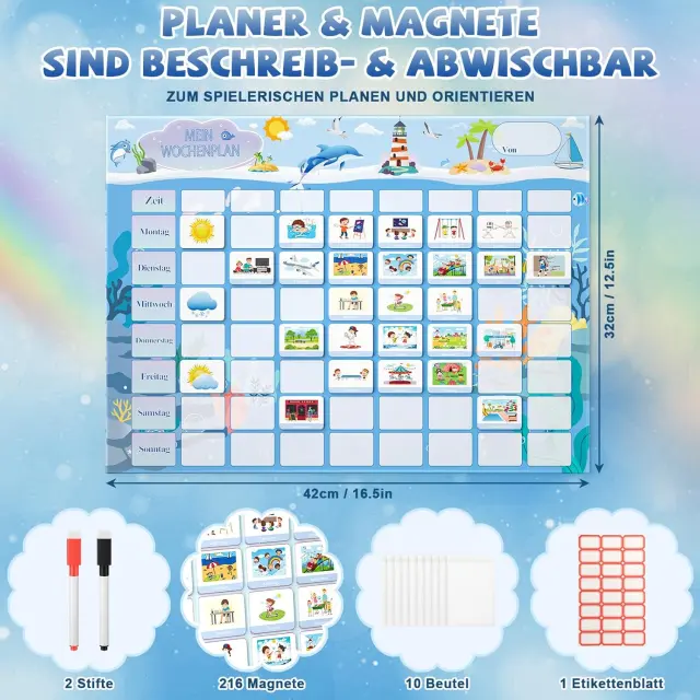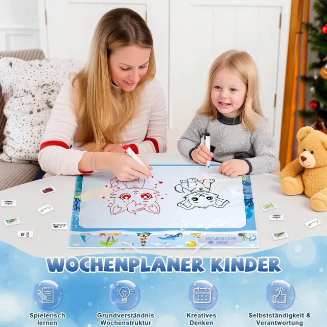 Tedenski planer MOMSIV je edinstvena magnetna tabla Montessori, ki otrokom pomaga pri učenju organizacije in samostojnosti na zabaven način. Komplet v barvni shemi Blue Ocean je zasnovan tako, da najmlajšim pomaga pri načrtovanju dnevnih in tedenskih aktivnosti s pomočjo privlačnih vizualnih elementov. Prijazen dizajn s prikupnimi živalmi in barvitimi detajli poskrbi, da tabla postane čudovita dekoracija otroške sobe, hkrati pa spodbuja otrokovo ustvarjalnost. Starši lahko planer prilagodijo individualnim potrebam otroka, kar omogoča strukturiran pregled nad vsakodnevnimi opravili in prostočasnimi dejavnostmi.