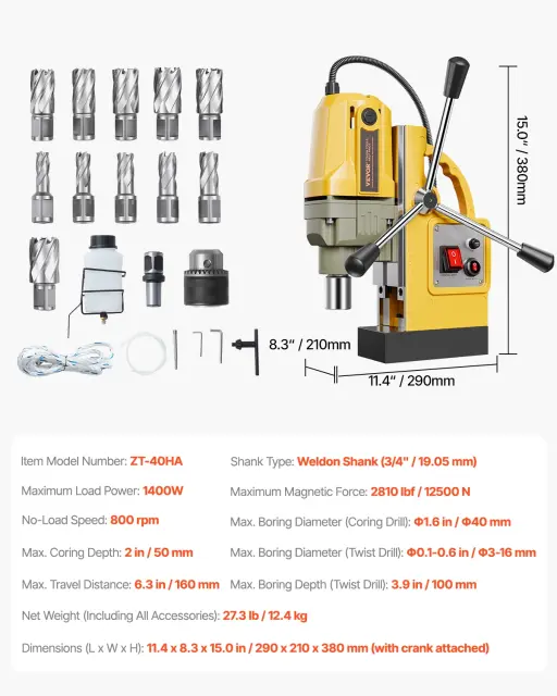 • Močna zmogljivost: Opremljena z robustnim 1400W motorjem, ta magnetna vrtalna naprava ponuja odlične možnosti vrtanja na različnih materialih pri hitrostih do 800 rpm.