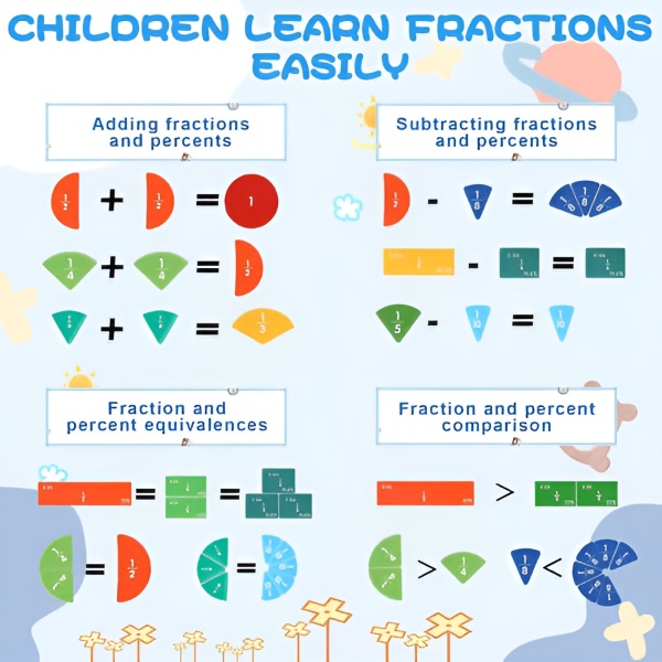Vključuje 9 barvitih magnetnih krogov in pravokotnikov, ki olajšajo predstavljanje in razumevanje ulomkov.