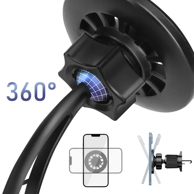 Magnetni nosilec za avto omogoča dostop do telefona za varnejšo vožnjo. Glede na svoje želje lahko izbirate med sponko za prezračevanje in sesalcem za armaturno ploščo.. Pametni telefon lahko postavite v pokončni ali ležeči način za ergonomsko uporabo. Priložena kovinska plošča za hitro namestitev naprave.