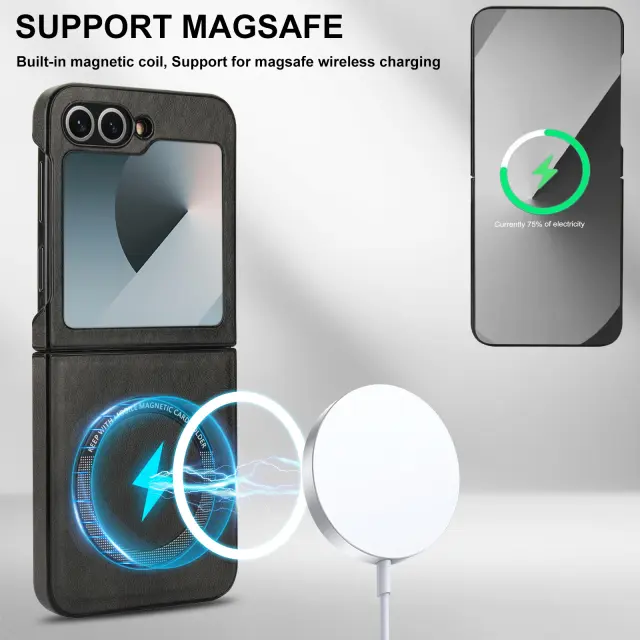 Močna magnetna povezava: Ta ovitek ima močne magnete, ki zagotavljajo varno in stabilno povezavo z vašim Samsung Galaxy Z Flip 6, kar omogoča brezhibno brezžično polnjenje.
