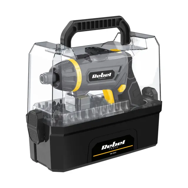 Izvijač Rebel Tools je opremljen s škatlo za shranjevanje nastavkov, ki vam omogoča, da ostanete organizirani in imate enostaven dostop do dodatkov, kadar koli jih potrebujete.