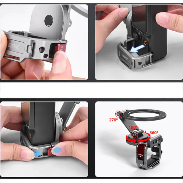 Brezhibna integracija: Magnetna zasnova zagotavlja brezhibno in varno pritrditev na vaš DJI Osmo Pocket 3. To odpravlja potrebo po zapletenih nastavitvah, kar vam omogoča hitro in enostavno namestitev naprave za takojšnjo uporabo. Močna magnetna povezava zagotavlja stabilnost in preprečuje neželeno premikanje med snemanjem, kar zagotavlja posnetke profesionalne kakovosti vsakič. Uživajte v brezskrbni izkušnji s tem uporabniku prijaznim magnetnim držalom.