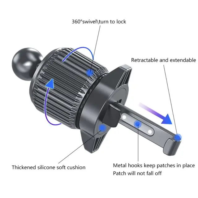 Namestitev na zračnik: Zasnova s sponko za zračnik tega držala za telefon ponuja varno in stabilno rešitev za montažo, ne da bi ovirala vaš pogled. Enostavno ga pritrdite na večino standardnih zračnikov v avtomobilu, kar zagotavlja trden oprijem, ki preprečuje zdrs ali tresenje. Nosilec za zračnik je zasnovan tako, da je združljiv z različnimi modeli avtomobilov, kar zagotavlja univerzalno prileganje. Ta način namestitve ohranja vašo armaturno ploščo čisto in brez nereda, kar ponuja eleganten in minimalističen videz. Postavitev na zračnik omogoča tudi optimalne kote gledanja, kar olajša hiter pogled na telefon za navigacijo ali klice, ne da bi umaknili pogled s ceste. Uživajte v varni in priročni izkušnji vožnje s tem zanesljivim avtomobilskim nosilcem za zračnik.